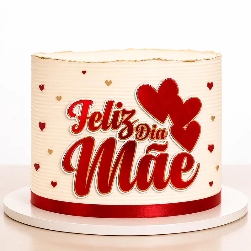O acabamento em efeito 3D valoriza o visual e cria um destaque incrível na decoração, deixando o bolo ainda mais bonito e chamativo. A frase “Mãe Feliz Dia” com coração traz um toque emocional que faz toda a diferença.